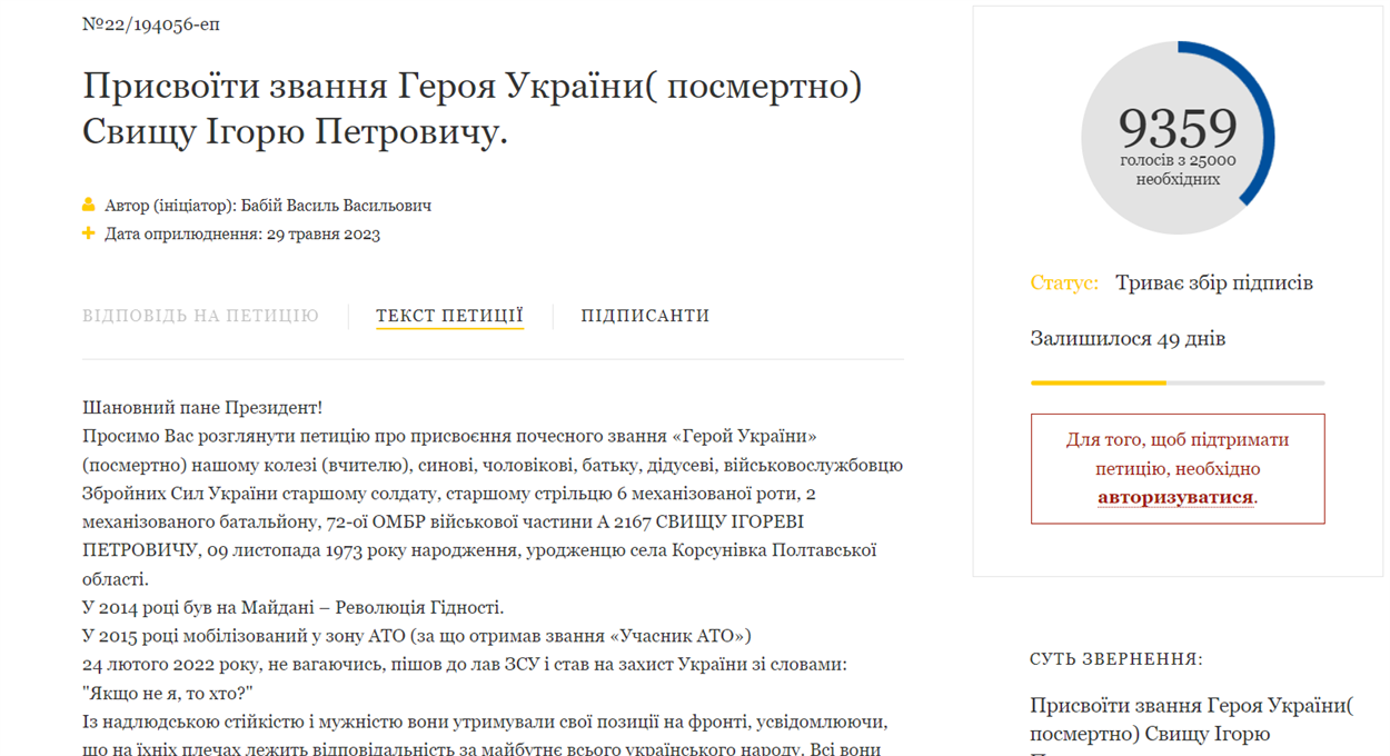 Кожен, хто зараз читає цей текст може підписати петицію про присвоєння. За цим посиланням ви знайдете текст петиції. Справа під кількістю підписантів ви знайдете поле авторизації. Без авторизації петицію неможливо підписати.