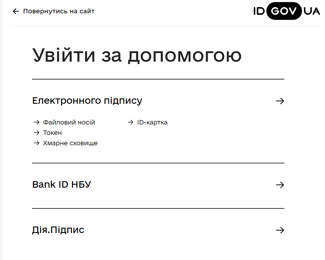 Перейшовши за посиланням авторизації ви потрапите у Дію, вам запропонують кілька варіантів авторизації. Найпростіше це заробити за допомогою Bank ID НБУ, при виборі якого з’явиться випадний перелік банків.