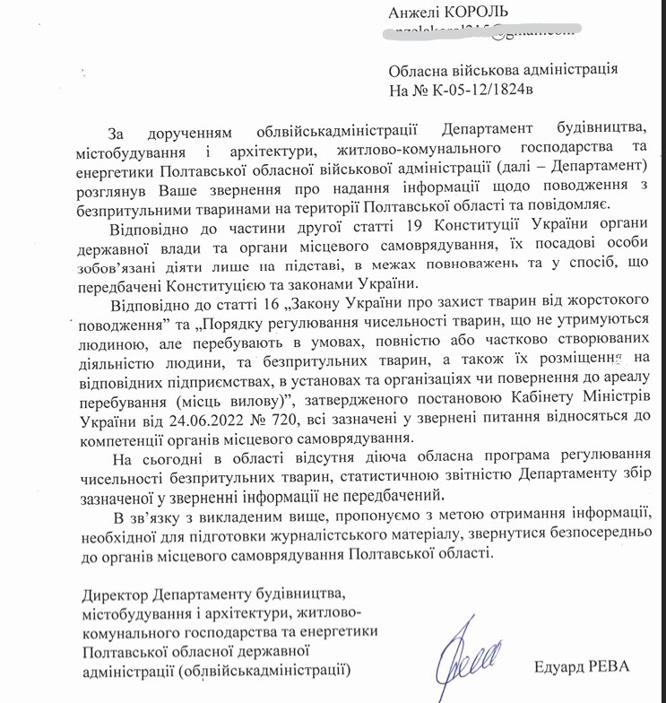Ми відправили офіційний інформаційний запит до Полтавської обласної військової адміністрації, щоб дізнатися, чи ведеться в області облік безпритульних тварин, чи існує обласна програма їхньої стерилізації та чи координується ця робота між громадами.