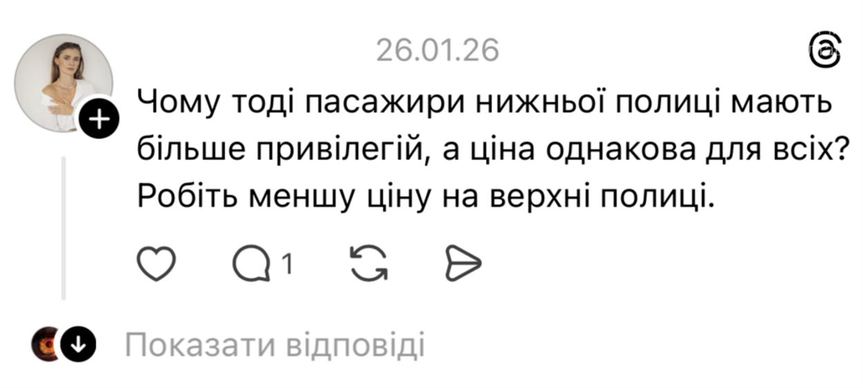 «Пасажири з верхніх полиць не мають автоматичного права займати простір під чужою нижньою полицею без згоди пасажира знизу. Пасажирам з верхніх місць рекомендовано зберігати свою ручну поклажу на верхніх багажних полицях та нішах пасажирського купе або за домовленістю з пасажиром на нижній полиці. Користування простором під нижньою полицею можливе лише за згодою пасажира, який займає це місце», — пояснили в компанії.