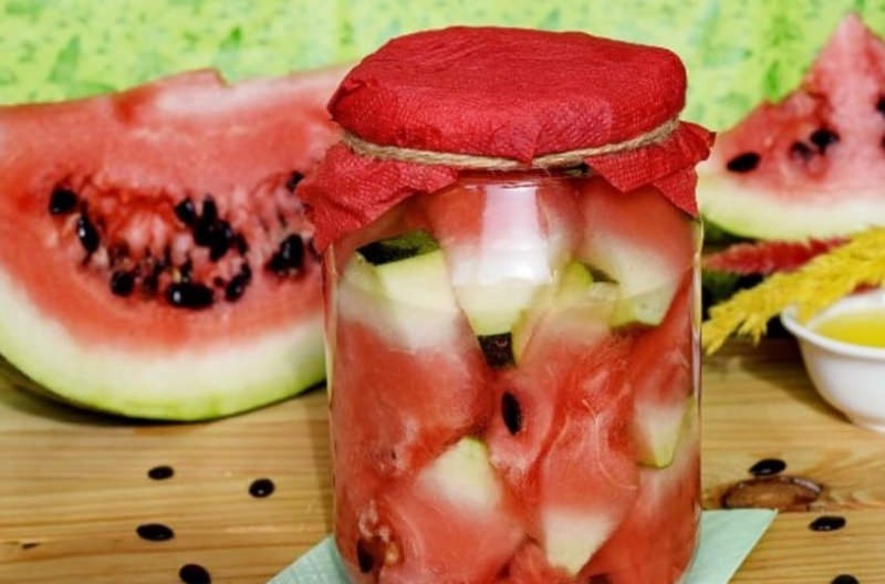 Порізати перчик чилі, видаливши насіння. В банку на дно скласти зелень селери, листя хрону, перчик чилі, часник та спеції. Кавун нарізати довільно, не зрізаючи шкірочку. Зверху викласти скибочки кавуна й залити все окропом із чайника. Накрити кришкою і дати постояти 10 хвилин. Потім воду злити з банки в каструльку й поставити на вогонь (можна ще додати 100-150 мл води – іноді не вистачає розсолу). У воду доти сіль і цукор та довести до кипіння. В банку з кавуном покласти лимонну кислоту. Залити киплячим маринадом. Закрити металевими кришками. Перевернути банку догори дном. Вкутати ковдрою до повного охолодження. Заготовка зберігається при кімнатній температурі у звичайній комірчині.